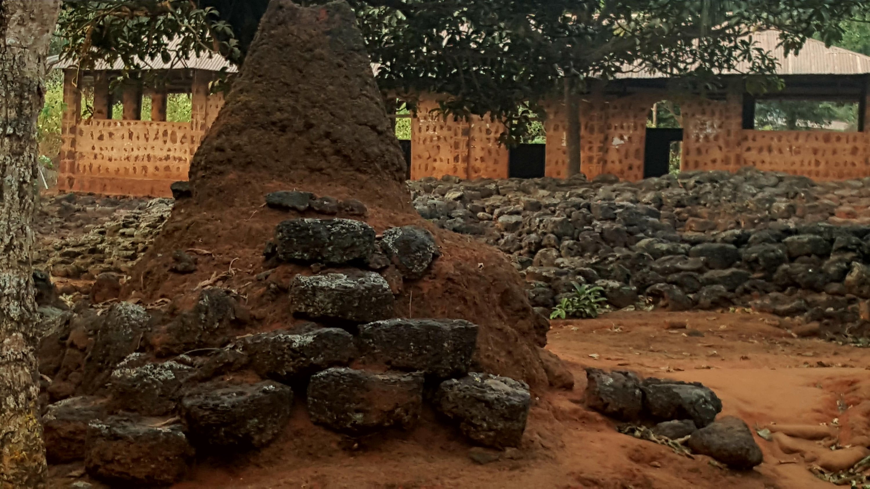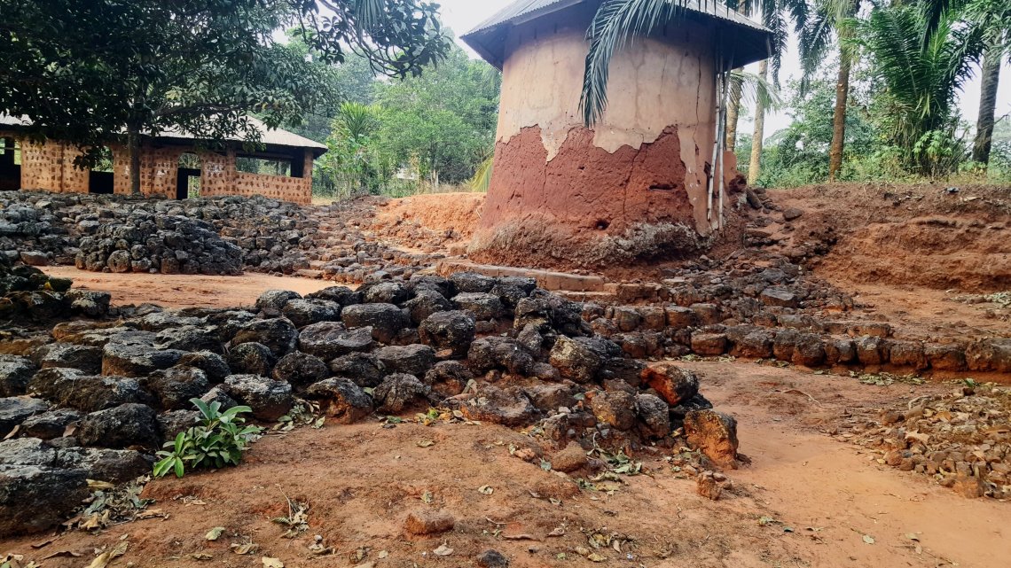 Other arrangements then spread out with the gentle slope of the square. In the middle there’s a raised mound of earth, around which slags are arranged. Other semi-circular heaps are also displayed around the square. To the right of the square, there’s a conical-shaped small building, the traditional masquerade’s house. At the base are also placed several slags.